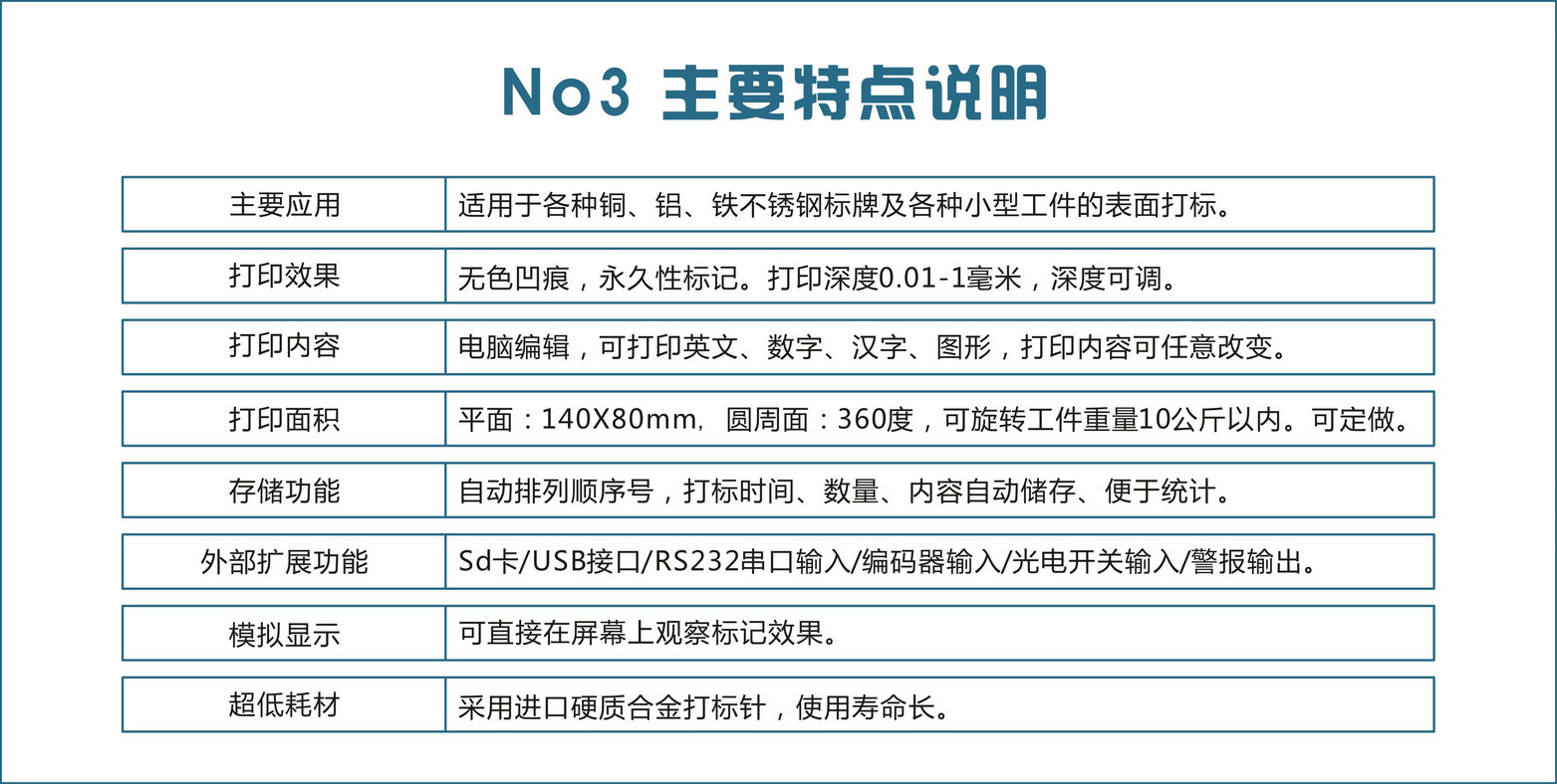 6、儲(chǔ)存功能 :自動(dòng)排列順序號(hào),打標(biāo)時(shí)間、數(shù)量、內(nèi)容自動(dòng)儲(chǔ)存、便于統(tǒng)計(jì)。