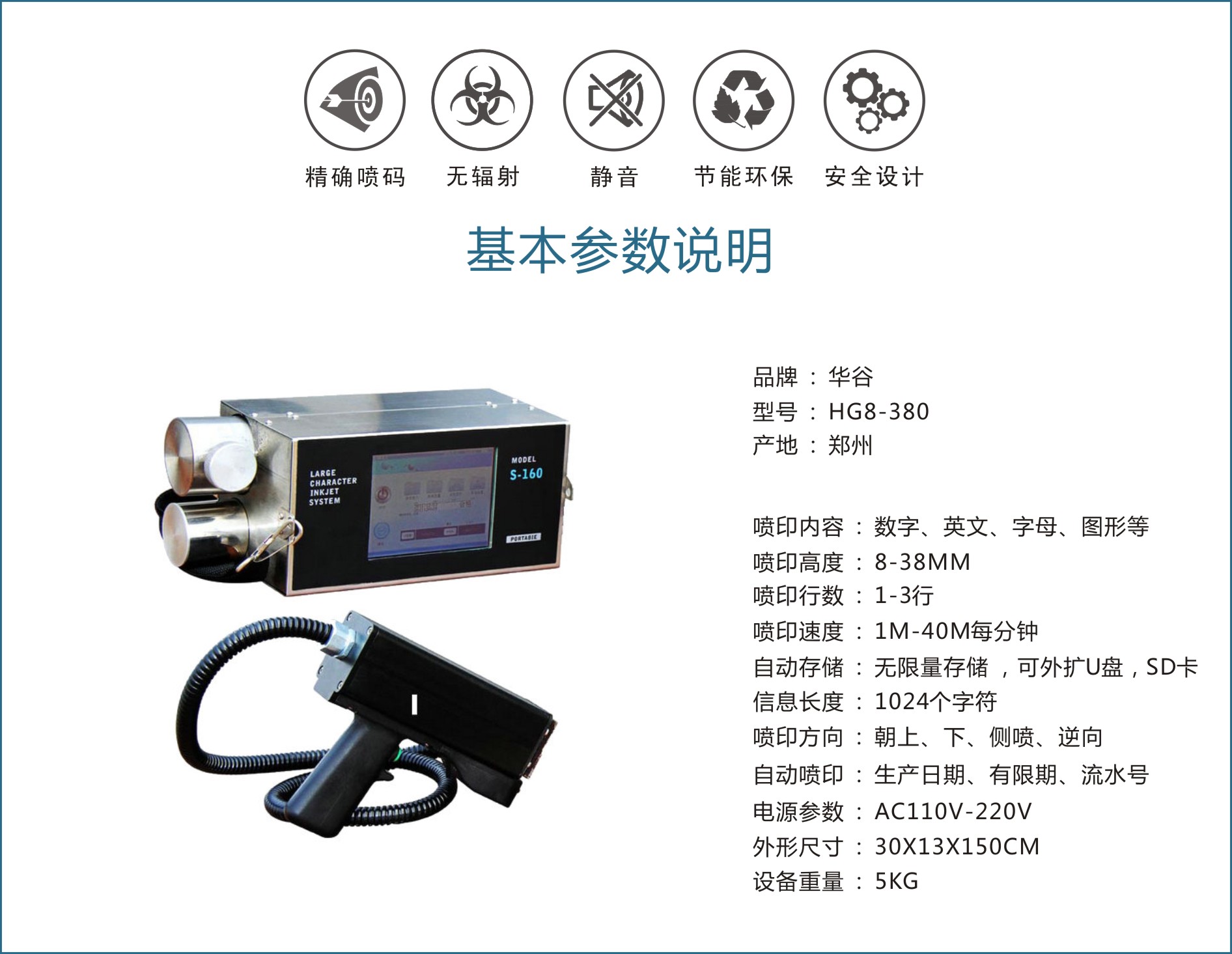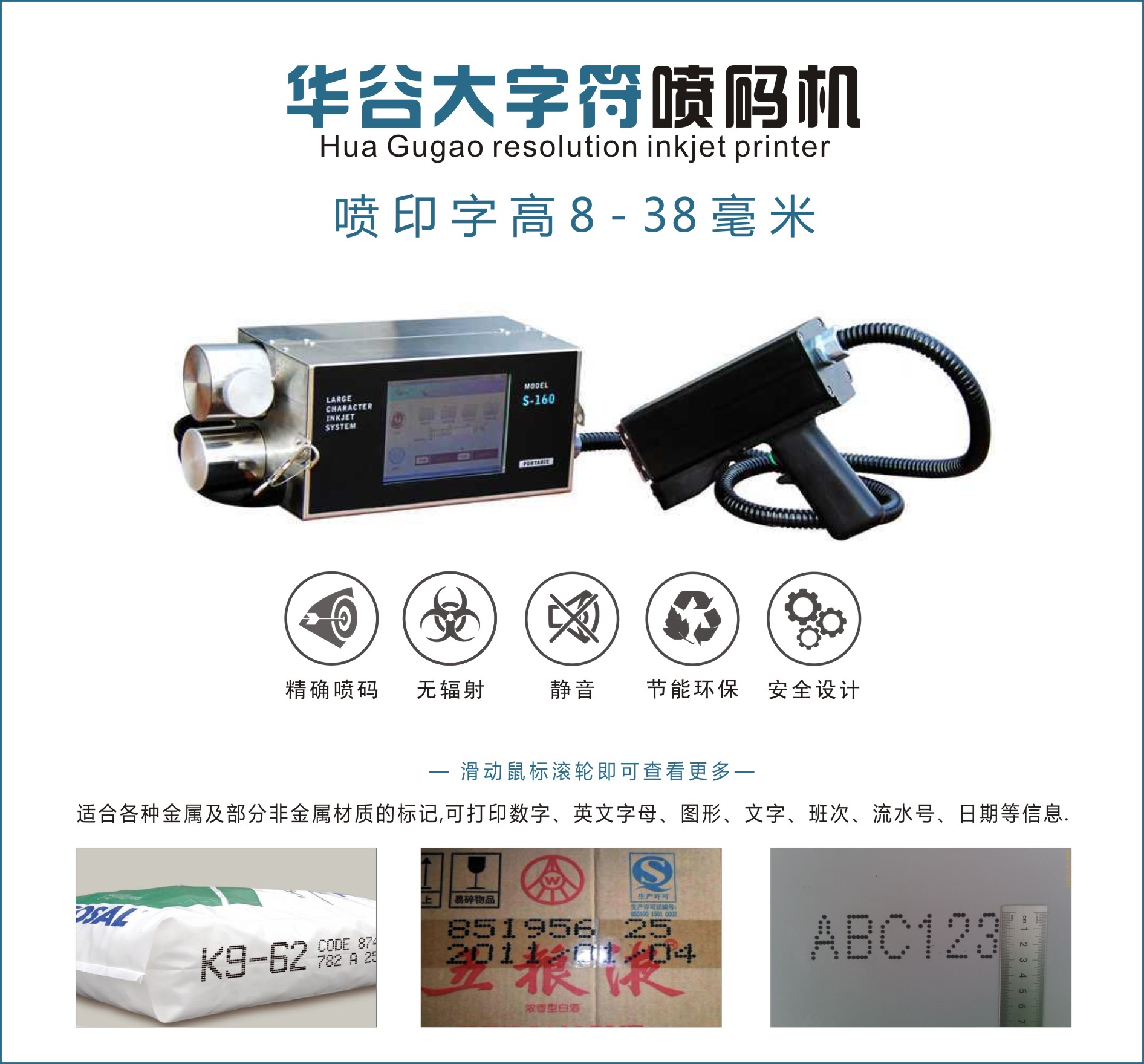 語(yǔ)言界面:中文,英文 規(guī)格與環(huán)境要求: 規(guī)格尺寸:300x130x150mm 重量:5kg(整機(jī)) 噴頭總管:1.2米 電壓:110/220 VAC, 50/60 Hz 溫度:-15°C ~55°C 濕度:10~95%無(wú)冷凝 304不銹鋼機(jī)箱 防護(hù)等級(jí):IP55 標(biāo)準(zhǔn)功能: 噴印行數(shù) 1-3行 噴印高度 8--38mm 噴印速度 40米/分(可調(diào)節(jié)) 噴印點(diǎn)陣 5*5,7*5,7*9,12*8,13*13,14*10,16*10,16*12,16點(diǎn)陣以內(nèi)自編點(diǎn)陣信息 噴印字體 英文,數(shù)字,漢字,特殊符號(hào),自編圖形(單個(gè)墨點(diǎn)大小可調(diào)節(jié)) 操作界面 彩色觸摸屏、中英文菜單 存儲(chǔ)信息 無(wú)限量存儲(chǔ) ,可外擴(kuò)U盤,SD卡 噴印內(nèi)容 日期、時(shí)間、自動(dòng)日期,自動(dòng)有效期,班號(hào),批號(hào)、流水號(hào)、三組計(jì)數(shù) 器,計(jì)米,自編圖案、仿偽碼、多國(guó)語(yǔ)言,多種字體(支持個(gè)人簽名) 噴印長(zhǎng)度 1024個(gè)字符 中文輸入 拼音輸入法 區(qū)位碼輸入法 字體加寬 1~9倍,可針對(duì)單個(gè)字符加寬 字體方向 正常字,反字,倒字,倒反字,可針對(duì)單個(gè)字符獨(dú)立設(shè)定噴印方向 字體間距 1~8倍,可逐點(diǎn)隨意編輯 通訊接口 RS232 ,USB ,SD卡 墨水規(guī)格 酮基墨水,醇基墨水,水基墨水,其他按要求定制的特殊墨水 噴印材質(zhì) 滲透性與非滲透性材質(zhì) 強(qiáng)大的噴印功能 可在線實(shí)現(xiàn)防偽碼噴印 可接收電腦編制的BMP圖案,可直接在觸摸屏上制作特殊字符或圖案,支持個(gè)人簽名具有編碼同步、光電同步、同步器同步定距、在線一次檢測(cè)N次噴印,N次檢測(cè)一次噴印等特殊功能??呻S意設(shè)定計(jì)數(shù)器步長(zhǎng),遞增,遞減,循環(huán)噴印等。 完美的數(shù)字電路控制系統(tǒng) 全數(shù)字智能菜單系統(tǒng)能全自動(dòng)數(shù)字顯示電路墨路系統(tǒng)中的各個(gè)重要參數(shù)點(diǎn),運(yùn)行數(shù)據(jù)等重要參數(shù)且可數(shù)字化調(diào)節(jié),讓設(shè)備運(yùn)行狀態(tài)一目了然。故障自動(dòng)檢測(cè)系統(tǒng)通過(guò)數(shù)字化菜單及信號(hào)燈自動(dòng)提示,能及時(shí)有效的排除故障。方便查詢。 特殊惡劣工業(yè)環(huán)境 采用抗磨損不銹鋼機(jī)箱,IP55防護(hù)等級(jí),適合各種惡劣環(huán)境使用。 擁有多路墨路系統(tǒng)處理系統(tǒng)和故障報(bào)警顯示功能,保證機(jī)器運(yùn)行更加穩(wěn)定,維護(hù)方便。 預(yù)留多路控制器輸出端口,可根據(jù)需要與客戶現(xiàn)場(chǎng)設(shè)備配合控制使用。